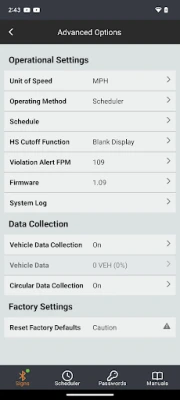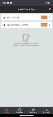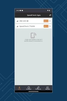 The app uses Bluetooth® Low Energy (BLE) wireless technology to connect to the SPEEDCHECK-12/15/18 sign. Once you’ve installed and powered up your sign, simply boot up the app and it will automatically scan for nearby SpeedCheck devices. Select your sign and program your desired settings, including device name, speed parameters, password, and others. Each setting is immediately updated on the connected sign. When you’re finished, just exit the app and your sign is ready and operational.