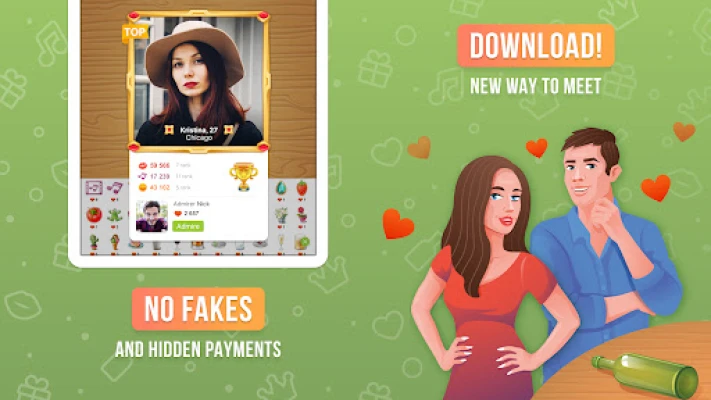 Game where you can talk to people. Kisses & gifts are main functions of a social chatrooms app: gaining more lifts higher at tournament tables & leagues. In Spin the Bottle kiss game - meet new people & make friends online, talk to strangers in free local chat rooms for free! With this chat room app free, join bottle online game flirty chat, use a friends finder to meet people near me, arrange a local meet nearby while playing Spin the Bottle game and random chatting with strangers! It’s for people who lack live communication, chat & need relationships or friendship online. Random chatting will solve problems. Play Spin the Bottle kiss game online & kiss someone nearby. You can also take part in Leagues. Leagues are competitions in which u can win hearts and access unique gifts. League points are awarded for gifts, kisses, music and admiration. Higher league is, more kisses u can get and more unique gifts will be unlocked!