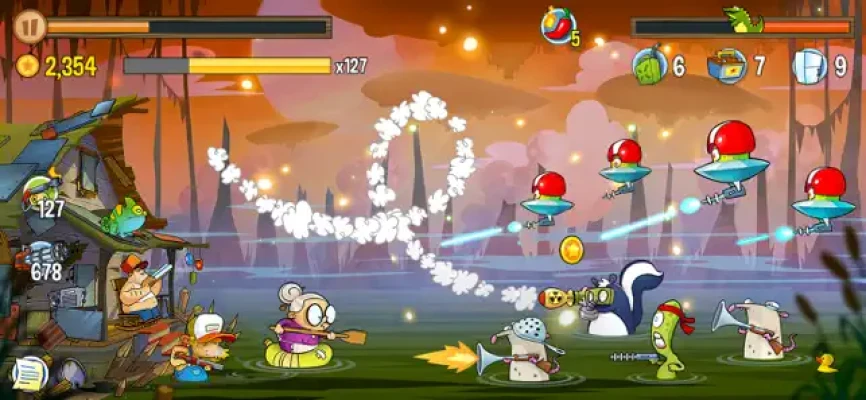 Your swamp is under attack! Grab a weapon and defend your home from the invading monsters, like crazed zombie-style monsters, crocodiles, aliens, evil mutants, and more!