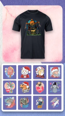 The t-shirt design maker app is very easy to use with tons of Art, Colors, and Textures. The t-shirt design studio includes a huge collection of categorized Art(Stickers), Graphic Elements, Shapes, Textures, and shirts with an evil cat.