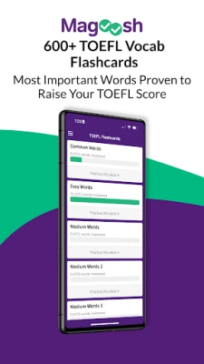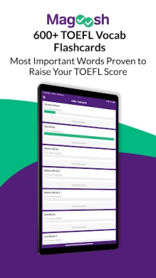 This app gives you free access to all of Magoosh’s TOEFL flashcards. Sign in with a Magoosh account (or create a new one) to save your progress to the web. You can continue your practice online at https://toefl.magoosh.com/flashcards/vocabulary