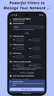 Advanced Filters: Filter users in your Bluesky network based on keywords, follower count, follower to following ratio, activity level, timeline and engagement for better targeting and analysis.