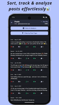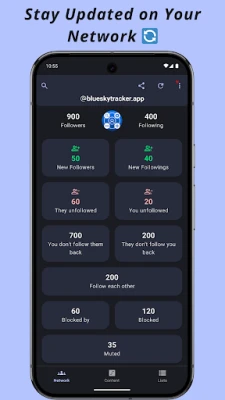 Manage your Bluesky network in real time! Track followers, unfollowers, blocks, mutes, likes, posts, and more β all in one easy-to-use app. Discover which Bluesky lists include your account and explore starter packs featuring your account for greater visibility.