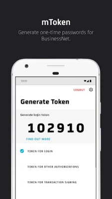 Activate Mobile Token. The app generates unique codes for authentication and authorization the transactions you create in BusinessNet. The authentication can be done also with Finger Scanner, if your mobile allows it.