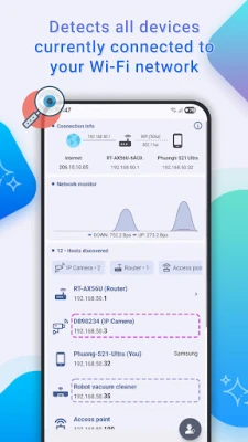 - Detect Wi-Fi Intruders: Scan your network in seconds to identify every connected device, including unauthorized users.