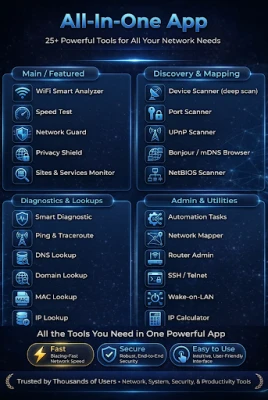 IP Calculator | MAC Lookup | IP Geo-location | Domain Lookup | Wake-on-LAN | SSH/Telnet Client | Router Default Credentials Reference | Local Wi-Fi Password Vault | Router Admin Guide | Automation Tasks