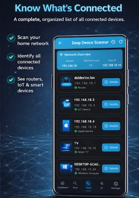 Identifies: Routers, Smart TVs, IP Cameras, NAS, Printers, Game Consoles, IoT devices, Servers, VoIP systems, Smart Home devices, and 30+ more categories.