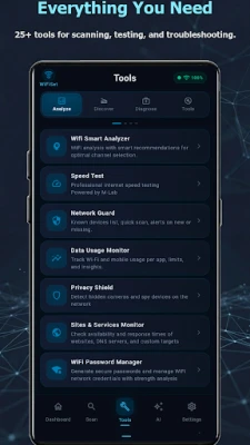 WiFiSet is a powerful Wi-Fi analyzer and network scanner that helps you find connected devices, detect unknown activity, fix Wi-Fi issues, and use 25+ professional tools — with no ads, no tracking, and local processing.