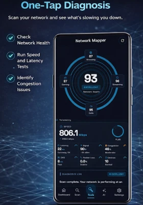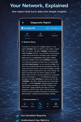 Smart Diagnose runs a multi-stage health check across your Wi-Fi and internet connection, then turns raw results into a clear explanation. It evaluates signal quality, latency, packet loss, DNS responsiveness, channel congestion, speed performance, and real-world usage impact such as browsing, streaming, calls, and gaming.