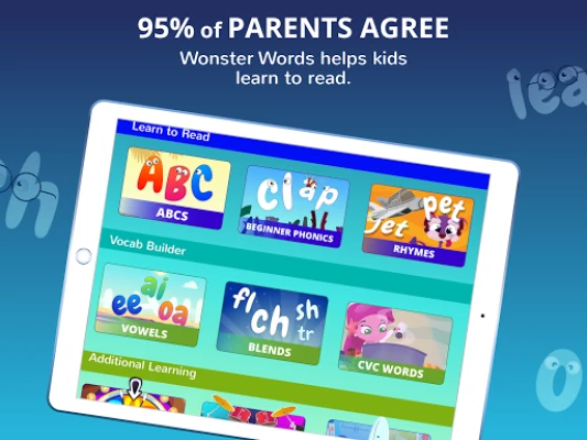 Help your children succeed in school by helping them master the skills appropriate for their reading level. For preschoolers and kindergarteners, Wonster Words help them practice ABC, letter recognition, letter sounds, and early phonics skills. For kindergarteners and early grades, the app focus on phonics, sight words, and basic spelling rules. The app includes a wide variety of phonics practices including vowels, consonant blends, word families, diphthongs, digraphs, CVC words - all are crucial skills to be a successful reader.