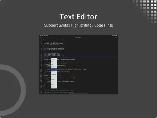 * Code Editor Supported Languages: JSON, HTML, XML, C/C++, Lua, Java, Objective-C, Swift, Python, JavaScript.