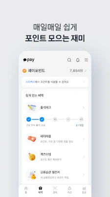 - 출석체크, 퀴즈타임, 매일모으기, 만보기 등 재미있는 혜택 서비스로 현금처럼 사용할 수 있는 페이포인트를 매일! 쉽게! 모아보세요.