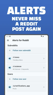 With Alerts for Reddit, you can get notifications within minutes for posts on your favorite subreddits, and posts/comments from your favorite users. Customize notifications by changing frequency and filtering with keywords.