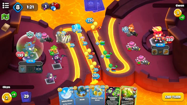 Monkeys can't attack other Monkeys, so you'll need to stock up on both Bloon AND Monkey cards in order to win. Send Bloons swarming at your opponent, fend off opposing Bloon rushes with your Monkeys, and find that perfect balance essential for victory!