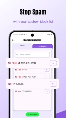 • Block by specific number, phone range, prefix, suffix, or country code.