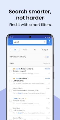 * Advanced email search: filter by sender, subject, attachment, folder, inbox