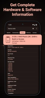 📟 Display: Display Details including Resolution, Density, Font Scale, Physical Size, Refresh Rates, HDR, HDR Capabilities, Brightness, Screen Timeout, Orientation.