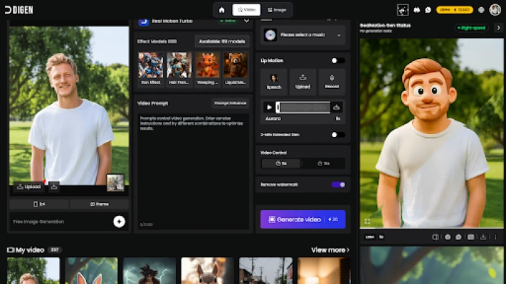 Just upload a picture and let our top-tier engine bring it to life. Whether it’s your cute pet, an epic fantasy scene, or a heartfelt memory, Digen helps you create videos that stand out from 99% of what’s out there.