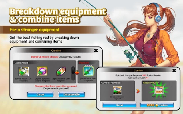- Acquire better fishing rods and rare items by adding the pieces from breaking down your fishing rod!