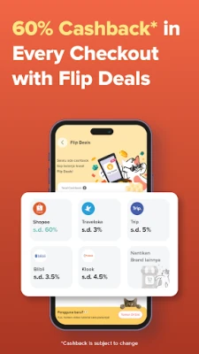 Get extra cashback when shopping online using Flip Deals! You can receive up to 60% cashback when you shop at Shopee, Traveloka, Blibli, Klook, and Trip.com.
