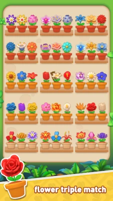 Match Three: Search for three identical flowers or objects and combine them to clear space on the board.