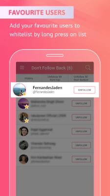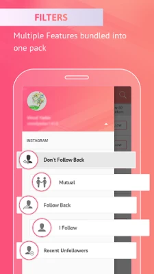 ★ Don’t Follow Me Back - People who don't follow you back on Instagram. ★ Mutual - Mutual followers, people you follow and they follow you back. ★ Follow Back - People you are not following on instagram. ★ I follow - All people you are following on instagram ★ Recent Unfollowers - People who unfollowed you recently. ★ Starred - Long press on any person from the list of people you follow to add them to your favourite list ★ Mass unfollow - Unfollow upto 50 people with a single action.