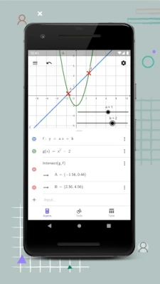 Graph functions, roots, and extrema. Find derivatives and integrals. Create tables of values. Solve equations and 3D math problems. Construct and analyze polygons, circles and conics. Create dynamic geometric constructions in 2D. Use Augmented Reality to explore 3D math objects in real life. Save and share your results. Millions of people around the world use GeoGebra to explore and learn math and science. Come join us!