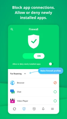 Instantly allow or deny new app connections with GlassWire’s new mobile firewall. The Firewall feature is based on a VPN connection (VpnService API) that GlassWire creates to block connections from unwanted applications. GlassWire never uses your personal information for commercial purposes, advertisement, or shares it with third parties.