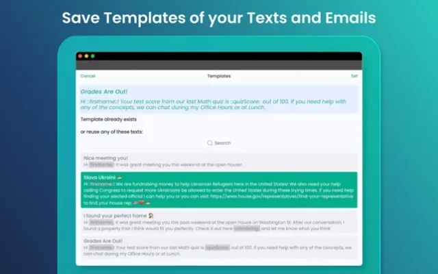 • Template Texts: Your message cookbook. Whip up tried-and-true recipes or save your signature dishes for future feasts.