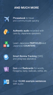 All-in-one application to learn Japanese. Hiragana, katakana, kanji, vocabulary, phrasebook, grammar, and MUCH more! Basic to advanced lessons. Smart progress tracking exercises to improve your writing, reading, speaking and listening skills. Discover surprising culture facts to think like a Japanese, and avoid embarrassing situations.