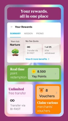 Lots of benefits are available to you in one place. Discover your free cash withdrawal quota, unlimited free transfers to other bank, Yay Points redemption, vouchers, and a variety of merchant offers in Your Rewards.