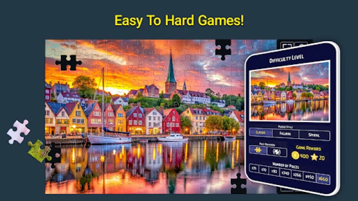- Adjustable style and difficulty. Challenge yourself with harder puzzles and get bigger rewards. Be a Jigsaw puzzle Master!