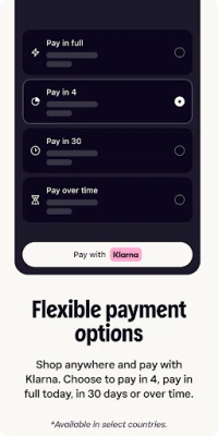 Shop anywhere in the Klarna app with flexible payment options. Choose to pay in 4 interest-free payments, pay the full amount, in 30 days or over time.¹