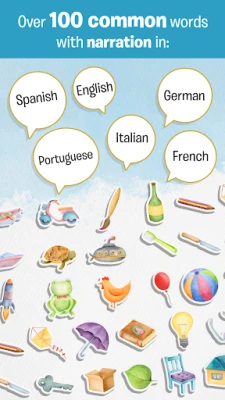 ๐ Children will learn fun words by associating cute artwork with their proper pronunciation in Portuguese, Spanish, English, French, Italian and German - you can switch languages whenever you like! Three ways to learn:
