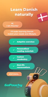 Learning Danish doesn’t have to feel like a chore - with GoPouchy, it's fun and effective! Expand your vocabulary naturally by diving into engaging reading materials tailored to your interests. Save challenging words and make them part of your exercises. Engage in real-time, realistic conversations with your AI tutor and get instant feedback on your grammar. Practice reading, writing, listening, and speaking through interactive exercises designed for all skill levels — whether you're a beginner or an advanced learner. Start your language journey today!