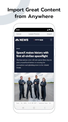 ✅ Import Your Own Content: Turn your favorite Netflix shows, YouTube videos, podcasts, books, and web articles into personalized French lessons. With the help of AI, read, listen, and learn from content you enjoy.