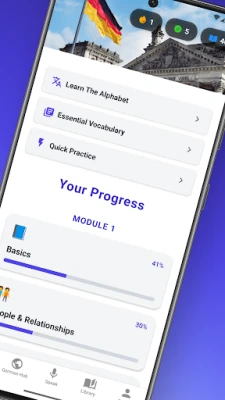 • General Learning Track: Follow a guided, step-by-step curriculum designed to help you progress naturally from beginner to advanced German.