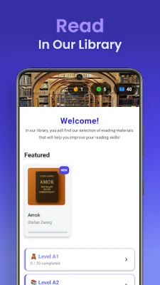 • Reading Library: Explore a wide variety of German reading materials, from simple texts to more advanced passages, each with comprehension questions to check understanding.