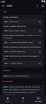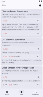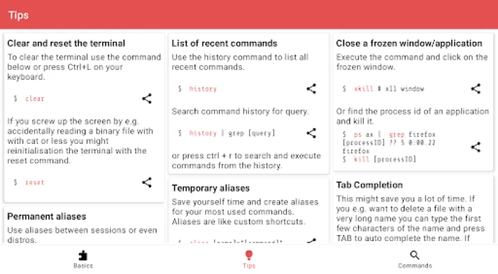 The app currently has 8436 manual pages, 28 basic categories and a bunch of general terminal tips. It works 100% offline, doesn't need an internet connection and has no tracking software.
