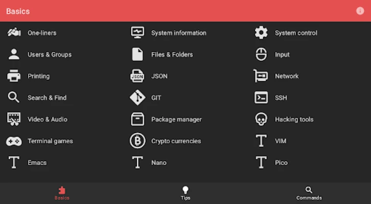 * One-liners * AI tools * System information * System control * Users & Groups * Files & Folders * Input * Printing * JSON * Network * Search & Find * GIT * SSH * Video & Audio * Package manager * Text Processing * Compression & Archiving * Hacking tools * Terminal games * Cryptocurrencies * Shell Scripting * Tmux * Regular Expressions * VIM Text Editor * Emacs Text Editor * Nano Text Editor * Pico Text Editor * Micro Text Editor