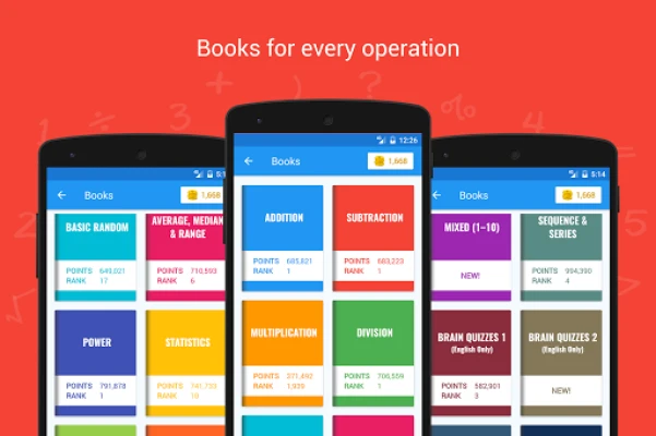 App offers a separate book for every mathematical operation. Simply tap the book and start playing! Available books are: