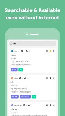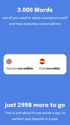 3000 words are all you need to easily express yourself and have everyday conversations in a language. This app has all the most common Spanish ones, always available on your phone, even while offline.