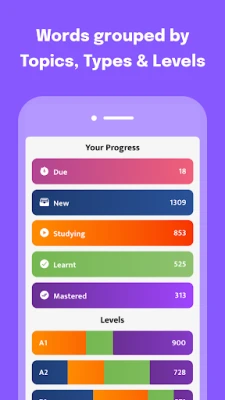 123416 example sentences to put words into context, with pronunciations Filter by Levels (A1, A2, B1, B2), Topics, Top 100 Groups, and Parts of Speech Study without even opening the app, even on your watch, with flexibly scheduled notifications Flashcard autoplay and auto-pronounce loops over your flashcards for times when you cannot use your hands Practice with your favorite quiz types to master all words