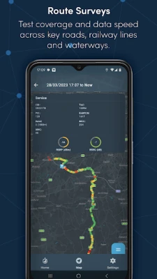 > Route survey, with built-in coverage and speed test features to measure your connection across key roads, railway lines and waterways