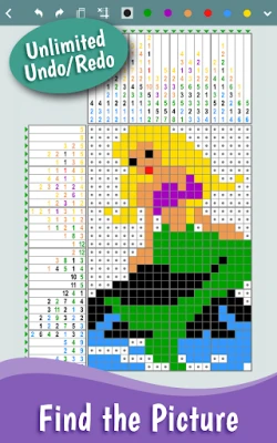 Paint squares as you solve the puzzle and discover a beautiful pixel-art picture! Each puzzle consists of a blank grid with clues on the left of every row and on the top of every column. The object is to reveal a hidden picture by painting blocks in each row and column so their length and sequence corresponds to the clues.