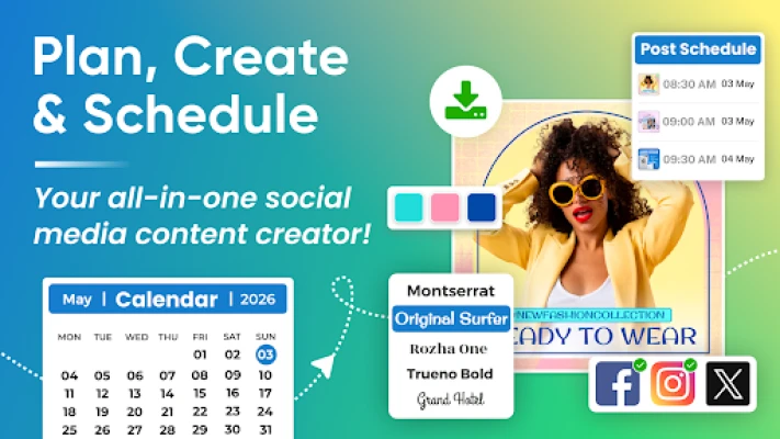 Download the ultimate social media post maker with Instagram post maker, Facebook post maker, professional social media templates, content planner, content calendar, poster maker, flyer maker, and post scheduler — all in one app.