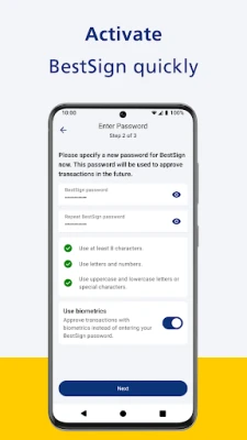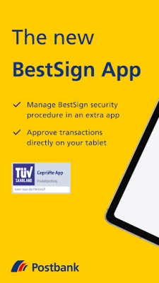 The Postbank BestSign app is a separate app for securely authorizing orders in online banking. The app only includes the BestSign security procedure. Create and activate BestSign once, then you are ready for authorizing.