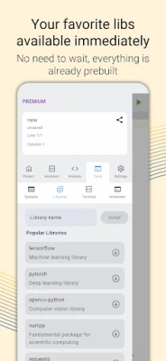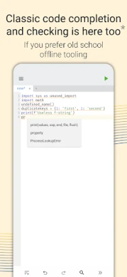 ✓ Professional Programmers: AI support combined with code completion and checking makes some real mobile development possible even on a mobile device. Run the most sophiscated code with our custom Python build and even deploy it to the other users of the app