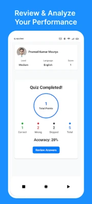 View detailed reports of attempted quizzes, generate PDFs, and share with friends.