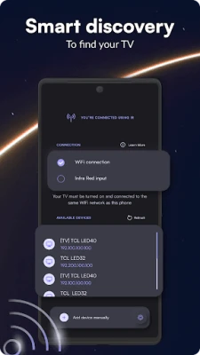 To use Smart TV or TCL Roku remote control you need to be connected to the same WiFi network as the TV. Unlike most remote TCL tv apps, our app is optimized to instantly discover your TV on the network so you can connect with the TV with the tap of a button.
